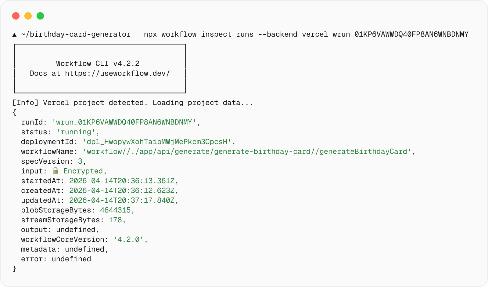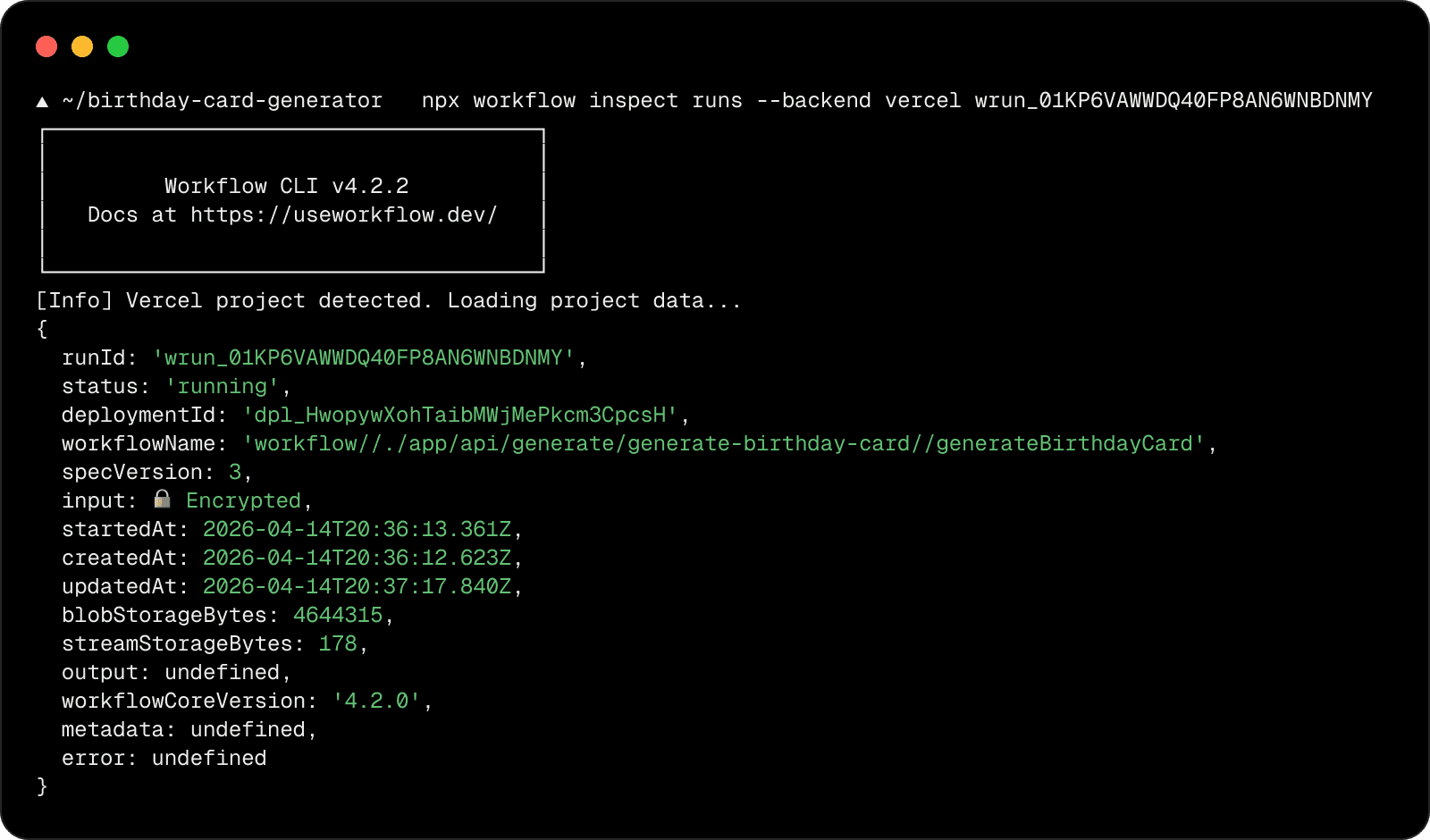 Workflow SDK ships with a CLI that any agent can use for inspecting and debugging your workflow runs. If a human can inspect runs in the dashboard, an agent can inspect the same workflow state from the terminal.